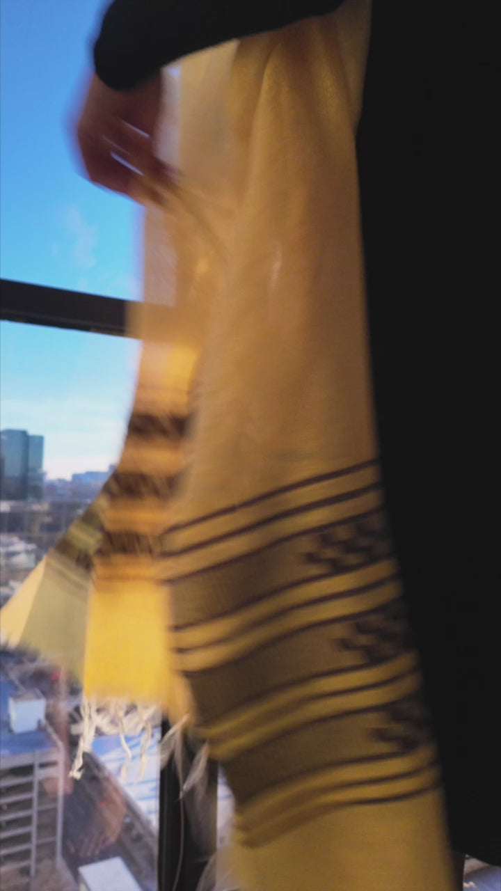 The Danakil Scarf is handwoven from hand-spun Ethiopian cotton and takes inspiration from the golden heat and expansive landscapes of the Danakil Depression. Its rich yellow body reflects sunbaked earth and salt plains, while the deep, structured geometric border grounds the piece in traditional weaving language.