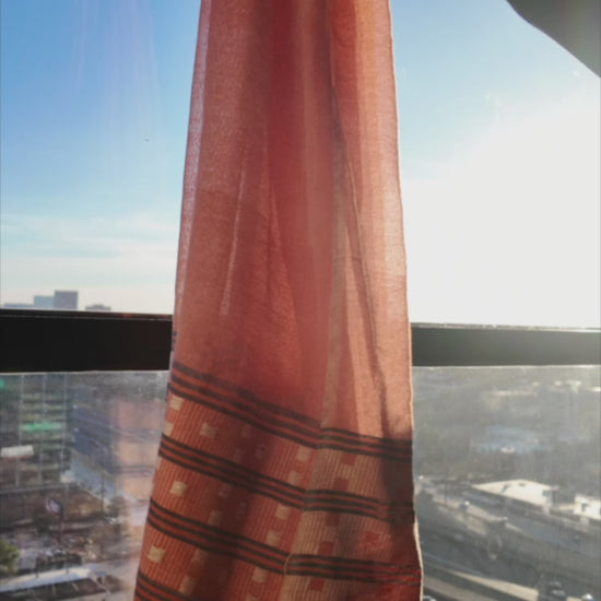 The Tekeze Scarf is handwoven from hand-spun Ethiopian cotton and draws inspiration from the warm earth tones and flowing movement of the Tekeze River. Its soft peach base is accented with a structured geometric border, creating a balanced contrast between fluid drape and traditional woven detail.
