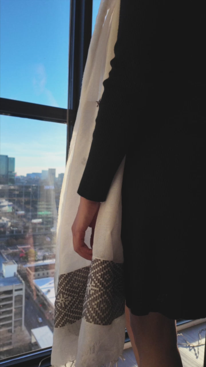 The Weyib Scarf is handwoven from hand-spun Ethiopian cotton and inspired by the quiet rhythms of the Weyib River. Its crisp white base is accented with delicate woven details and anchored by a finely patterned geometric border, reflecting a balance of simplicity and traditional craftsmanship.